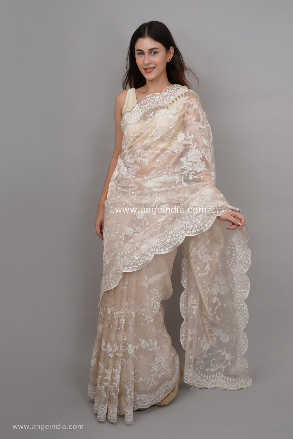 Tissue organza saree with jaal patterns across the saree and elegant silver scallop work on the edge of the saree. Comes with plain tissue organza blouse fabric.