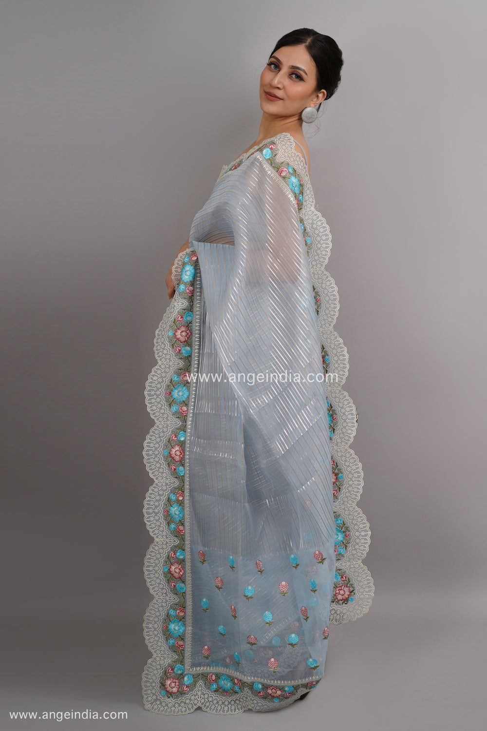 Laila is a organza saree with gold stripes finished sheer scallop edging and floral motifs along the edges. It comes with pure organza silk blouse fabric.