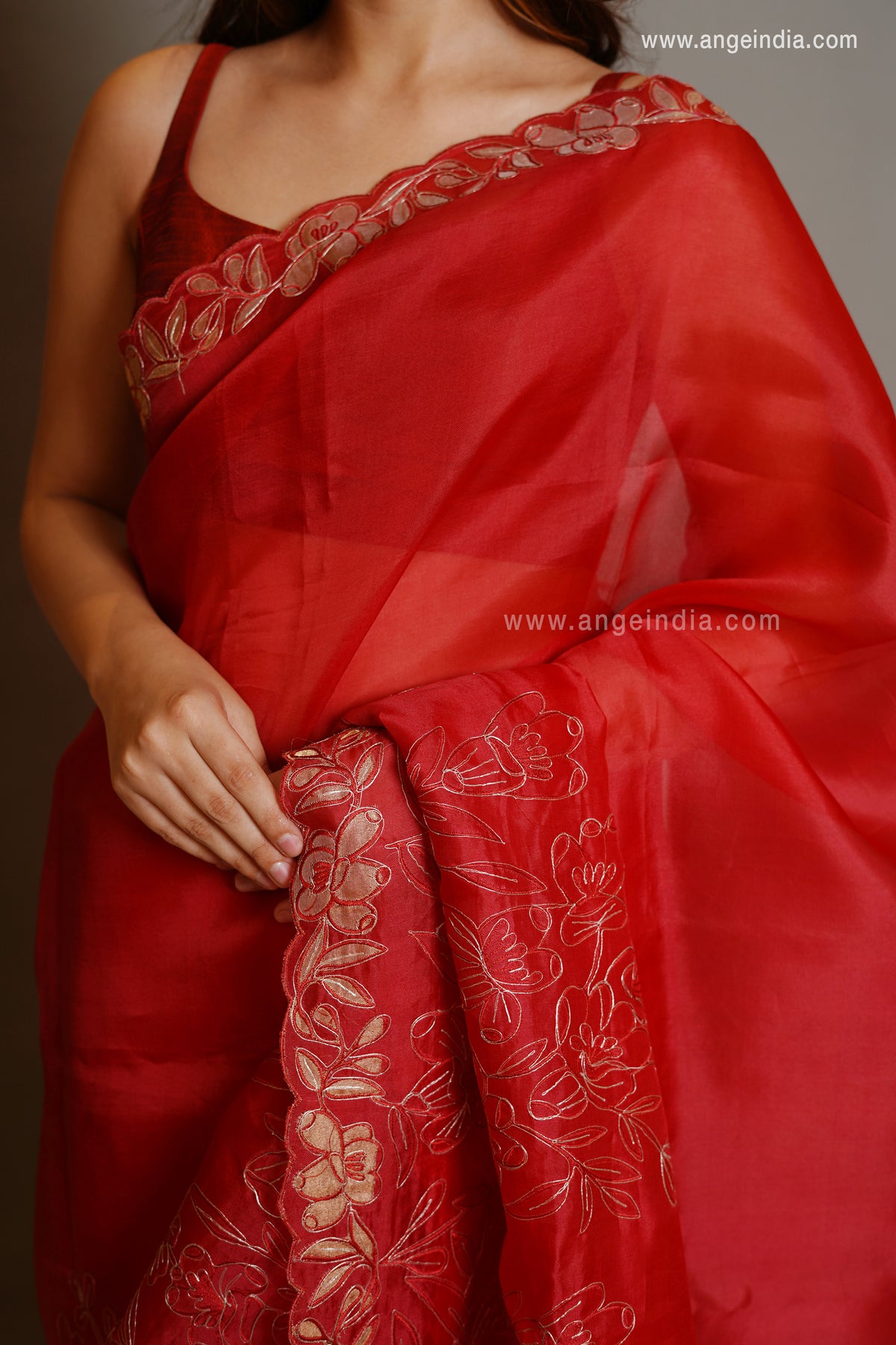 Whispers of silk organza, woven in crimson dreams and kissed by gold - a festive ode to timeless grace.