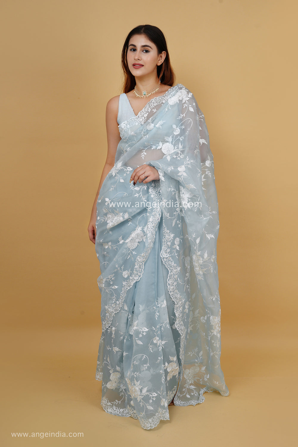 The saree is complete with a rich scalloped edging that adds to the beauty of the drape. All this in a gorgeous powder blue tint which makes it a quintessential piece for your evening soirees and special occasions.