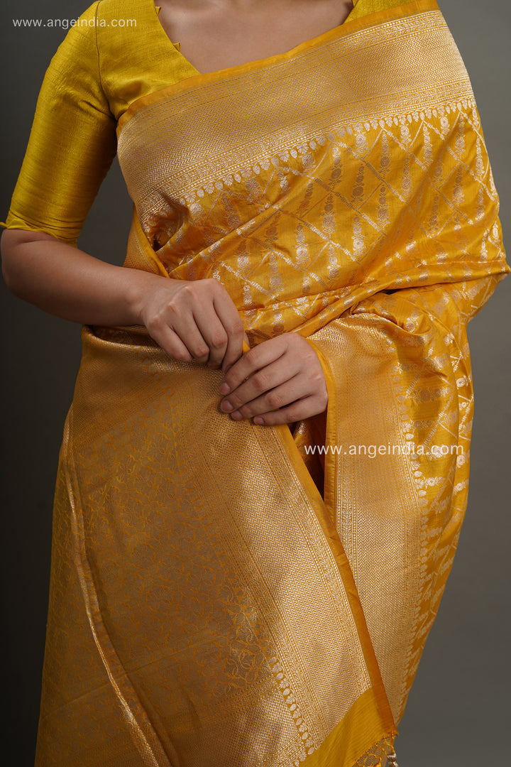 Embrace timeless elegance with this exquisite Yellow Banarasi Handloom Saree, adorned with intricate antique gold geometrical patterns. This masterpiece seamlessly combines traditional craftsmanship with modern sophistication, featuring meticulously woven motifs that reflect the rich cultural heritage of Banaras. Perfect for weddings, festive occasions, or any celebration, this saree radiates a regal charm and offers an unparalleled grace that is both classic and contemporary.