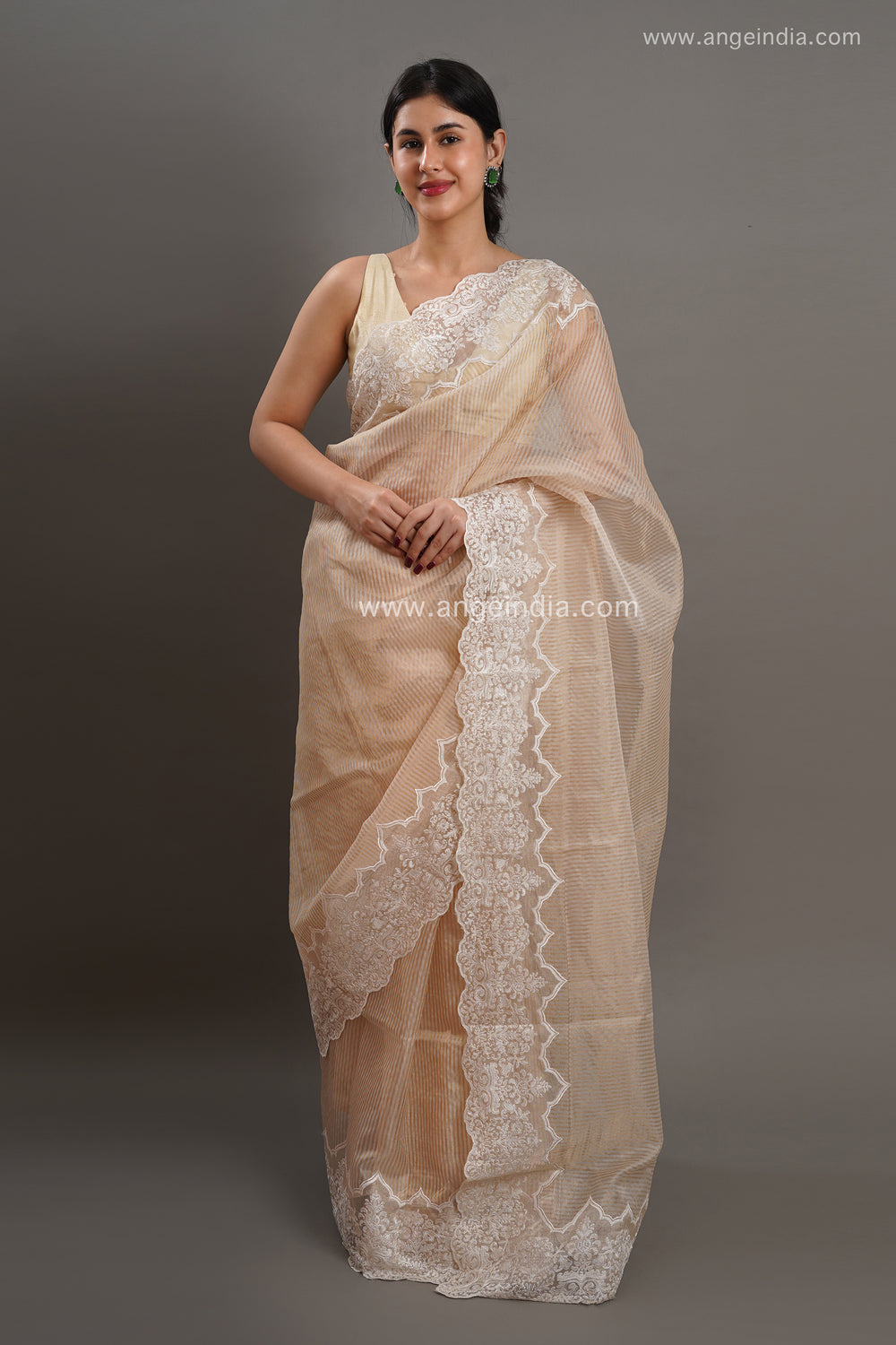 Embrace the essence of summer elegance with our subtle gold striped Silk organza saree in ivory. This dreamy creation, adorned with a delicate lace border, captures the ethereal charm of a warm, sunlit day. Perfect for those who seek a blend of sophistication and grace, this saree promises to be a timeless addition to your wardrobe. Let its lightweight fabric and intricate details envelop you in a luxurious embrace, making every moment feel like a serene, golden dream.