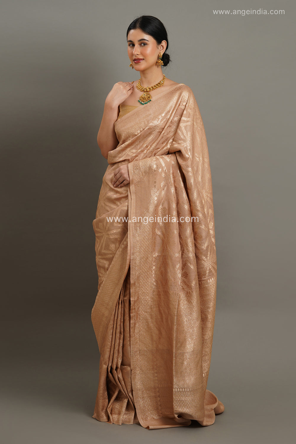 Unveil the allure of heritage with this gorgeous Tussar Georgette Banarasi saree, a true masterpiece of elegance. The intricate geometrical patterns add a modern twist to its traditional charm, while the luxurious fabric drapes beautifully, creating a regal silhouette. With its rich texture and impeccable Nude shade, this saree effortlessly blends grace with grandeur, making it perfect for those special occasions where you want to make an unforgettable statement.