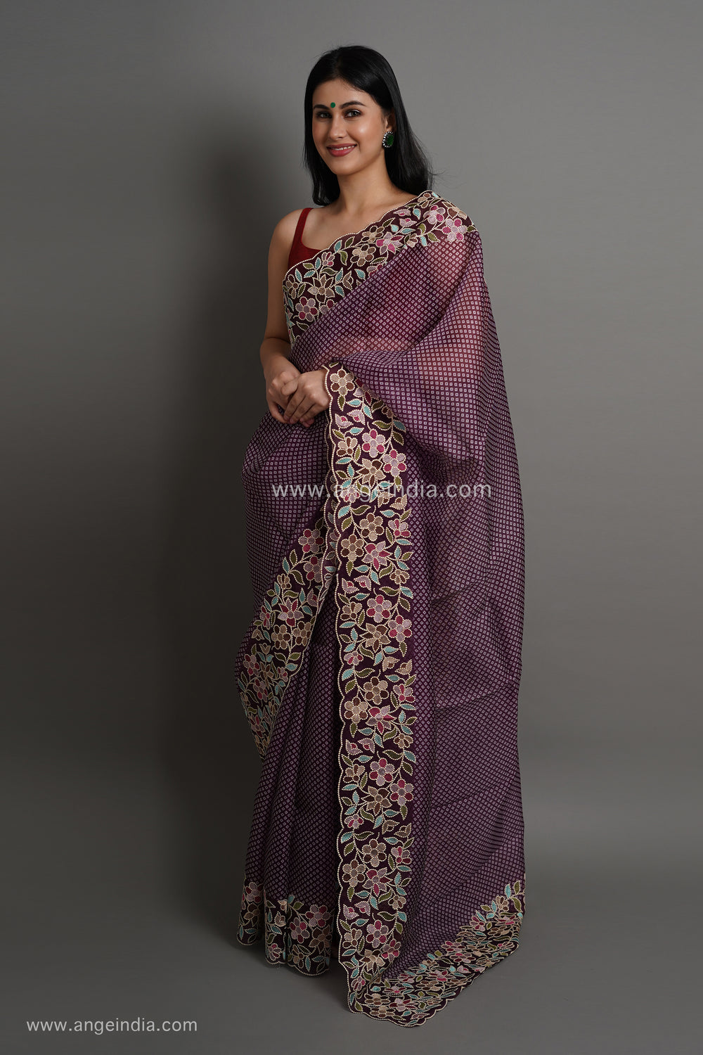 Bandini design inspired pure organza silk saree with floral thread embroidery and scallop edging.