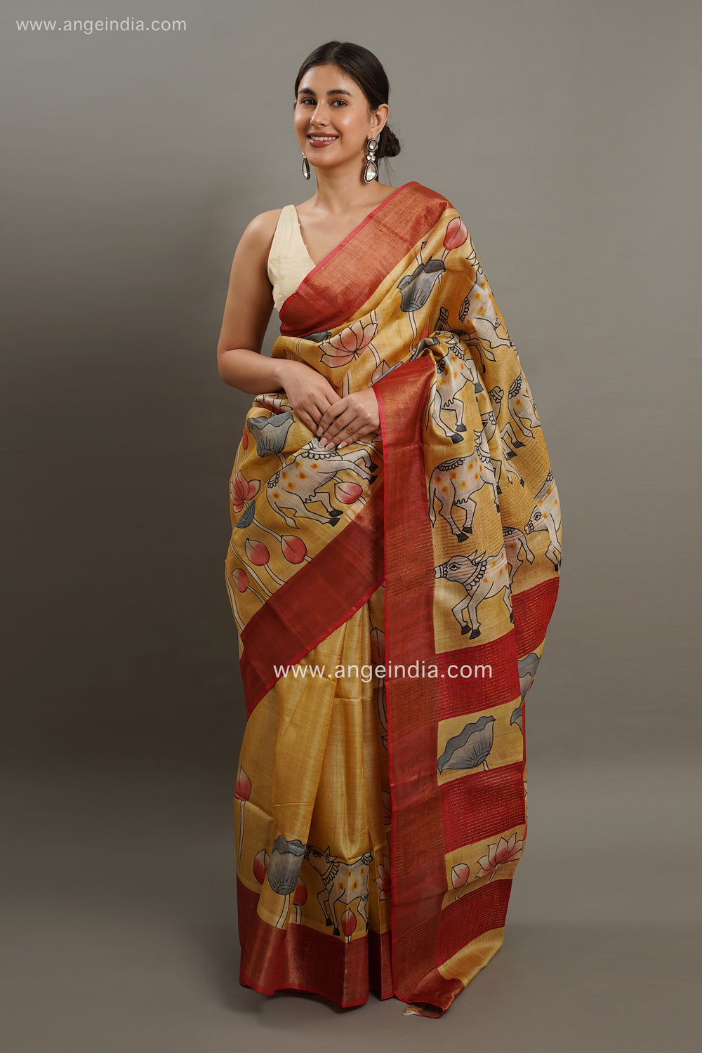 A true celebration of traditional Indian artistry. Here’s to the timeless elegance of Indian heritage with our pichwai Tussar silk saree. This exquisite drape, crafted from the finest Tussar silk, showcases the intricate pichwai art, renowned for its detailed depiction of Krishna and pastoral scenes. Its light, airy texture allows for a graceful flow, perfect for any occasion. Embrace the art, culture, and elegance of India with every fold of this elaborate saree.