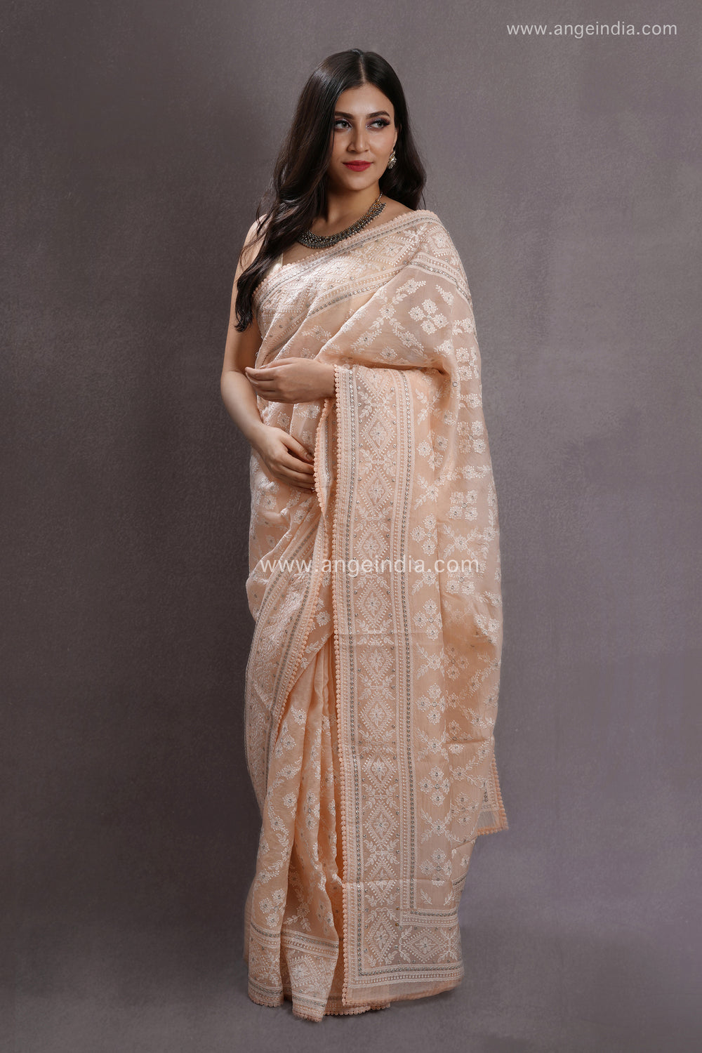 Pure organza silk saree with thread embroidery. Comes with a plain organza silk blouse fabric in peach.