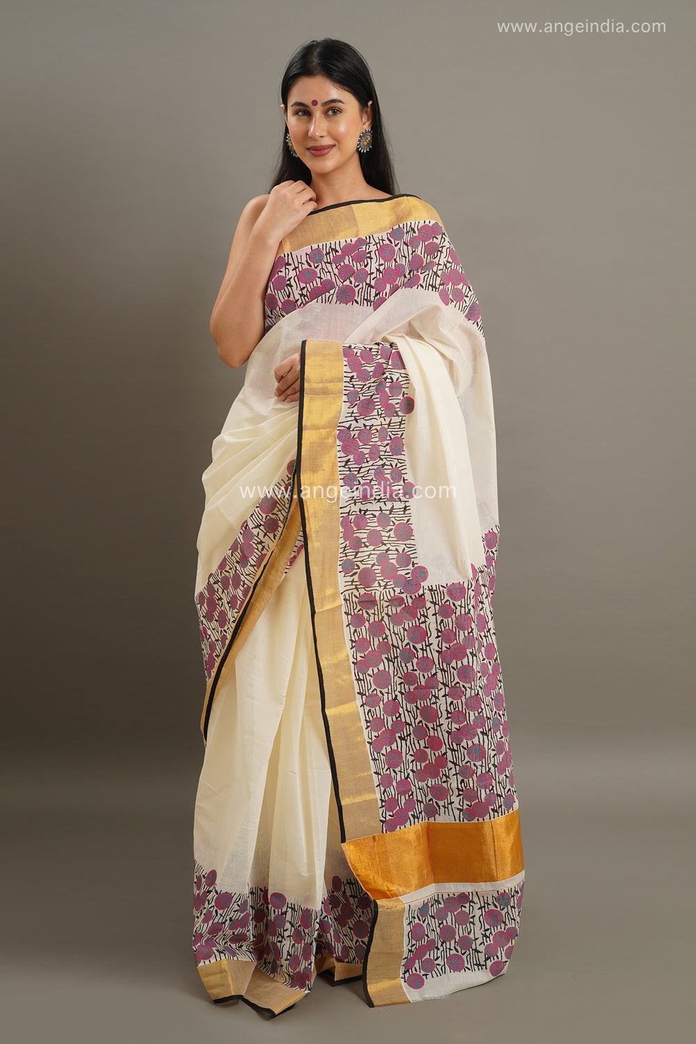 This festive season, drape yourself in the enchanting allure of a Kerala saree that beautifully marries tradition and modernity. Crafted from pure cotton and gold kasavu, this saree features an exquisite interplay floral patterns. Each motif tells a story of artistic brilliance, adding a vibrant touch to the classic elegance of the saree. Perfect for festivals and special occasions, this saree not only reflects the rich cultural heritage of Kerala but also resonates with contemporary fashion sensibilities.Saree Length: 5.5 Mtrs