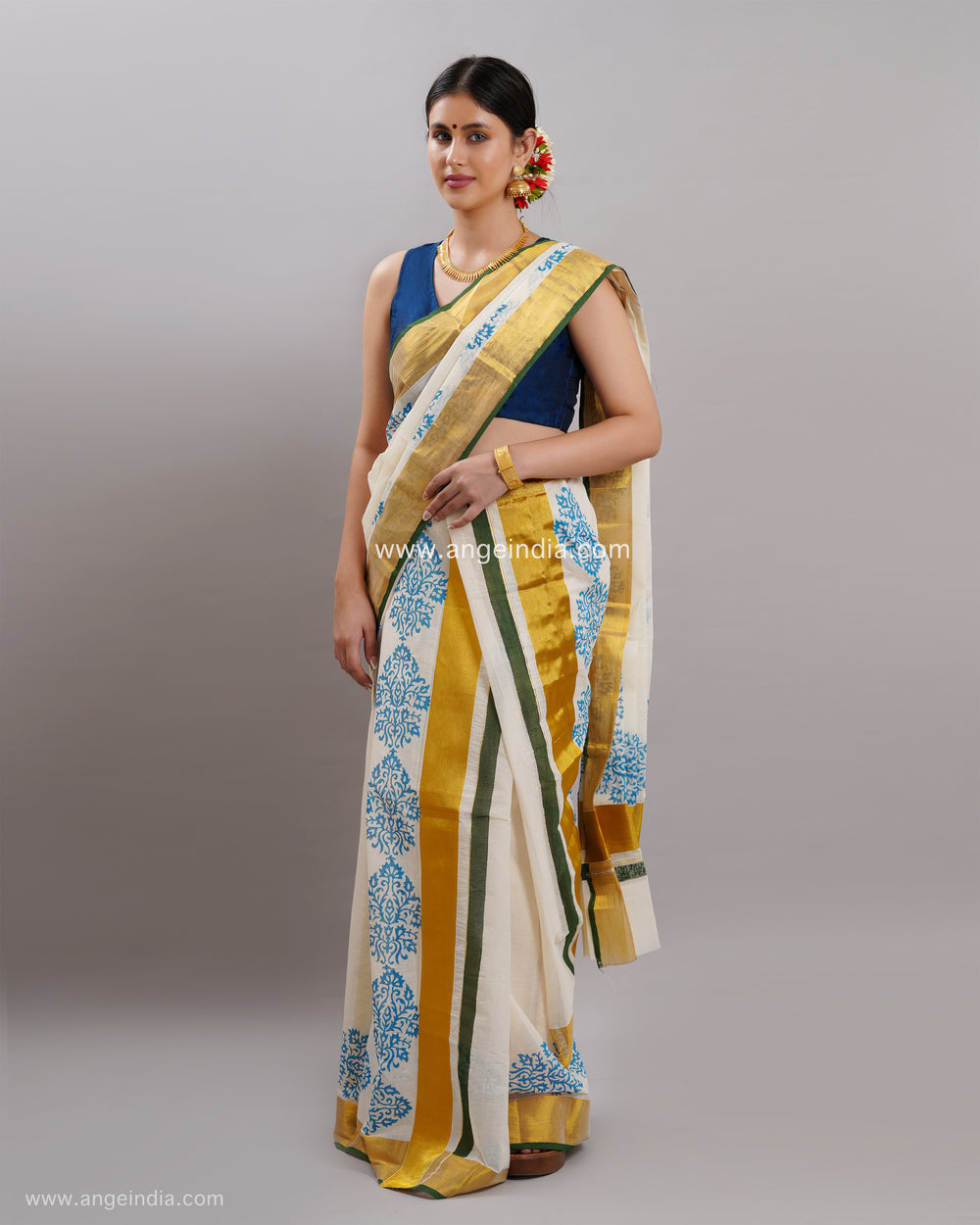 Hand-blocked cotton set mundu. Comes with hand blocked blouse fabric.