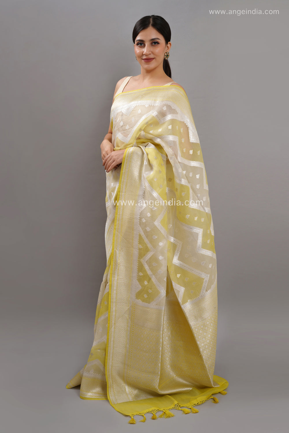 Organza silk saree in Banarasi silver zig-zag patterns with a heavy pallu and tassels.