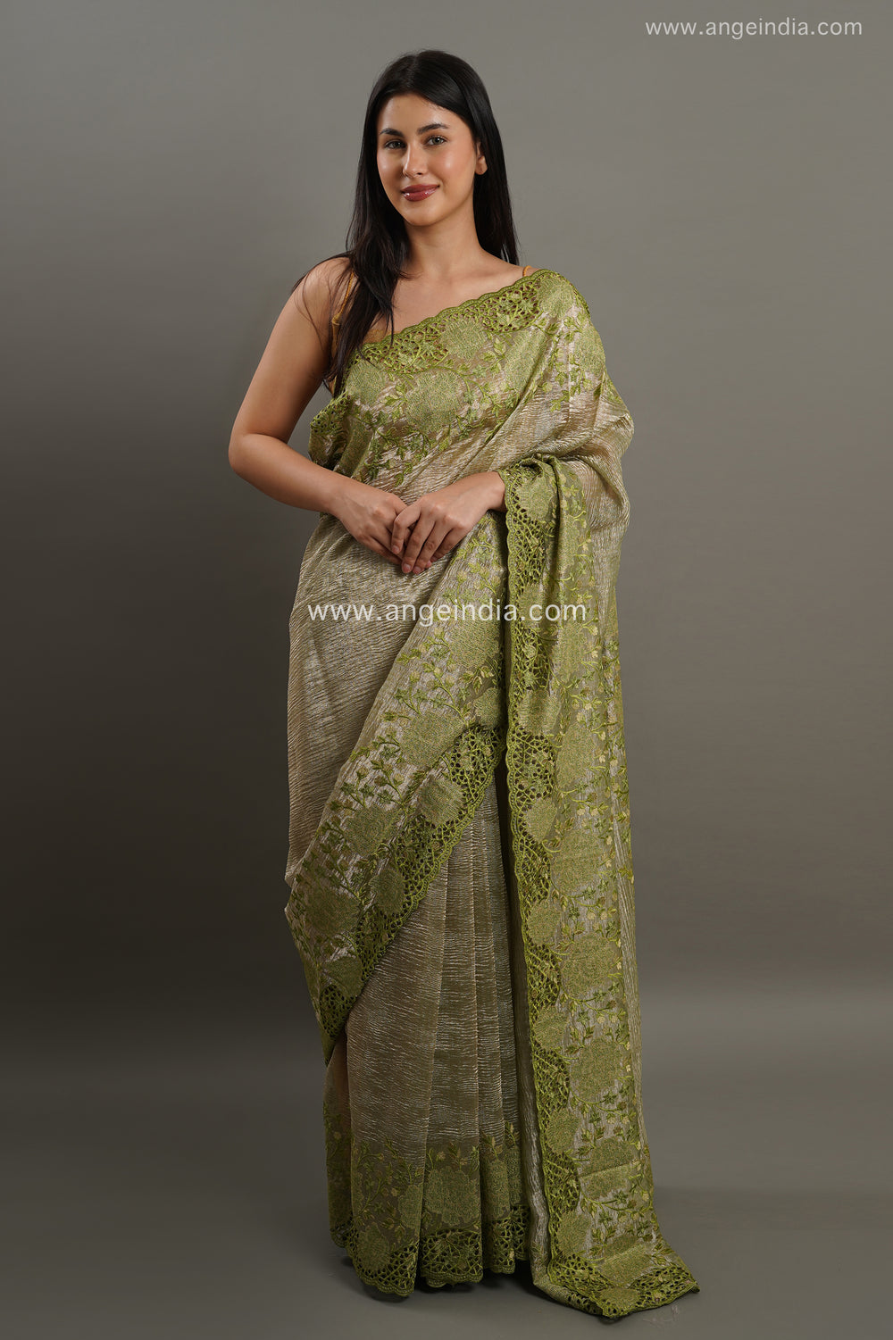 Embrace the enchantment of the crushed tissue organza saree, where beauty knows no bounds and every moment is imbued with the magic of cutwork florals and flowing fabric