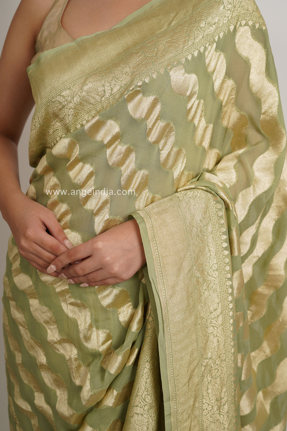 Pure handloom Banarasi Georgette saree with gold stripes.