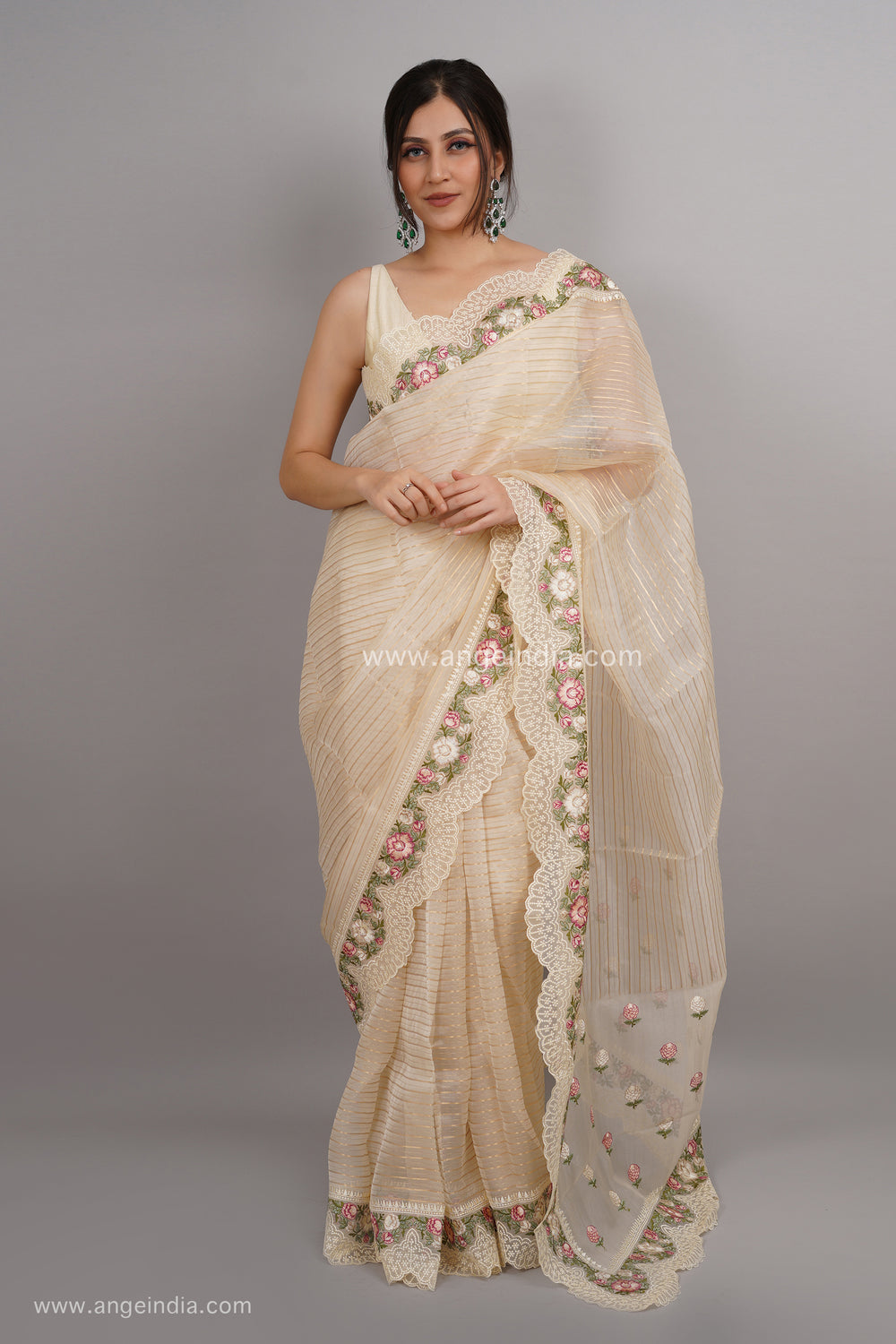 Laila is a organza saree with gold stripes finished sheer scallop edging and floral motifs along the edges. It comes with pure organza silk blouse fabric.