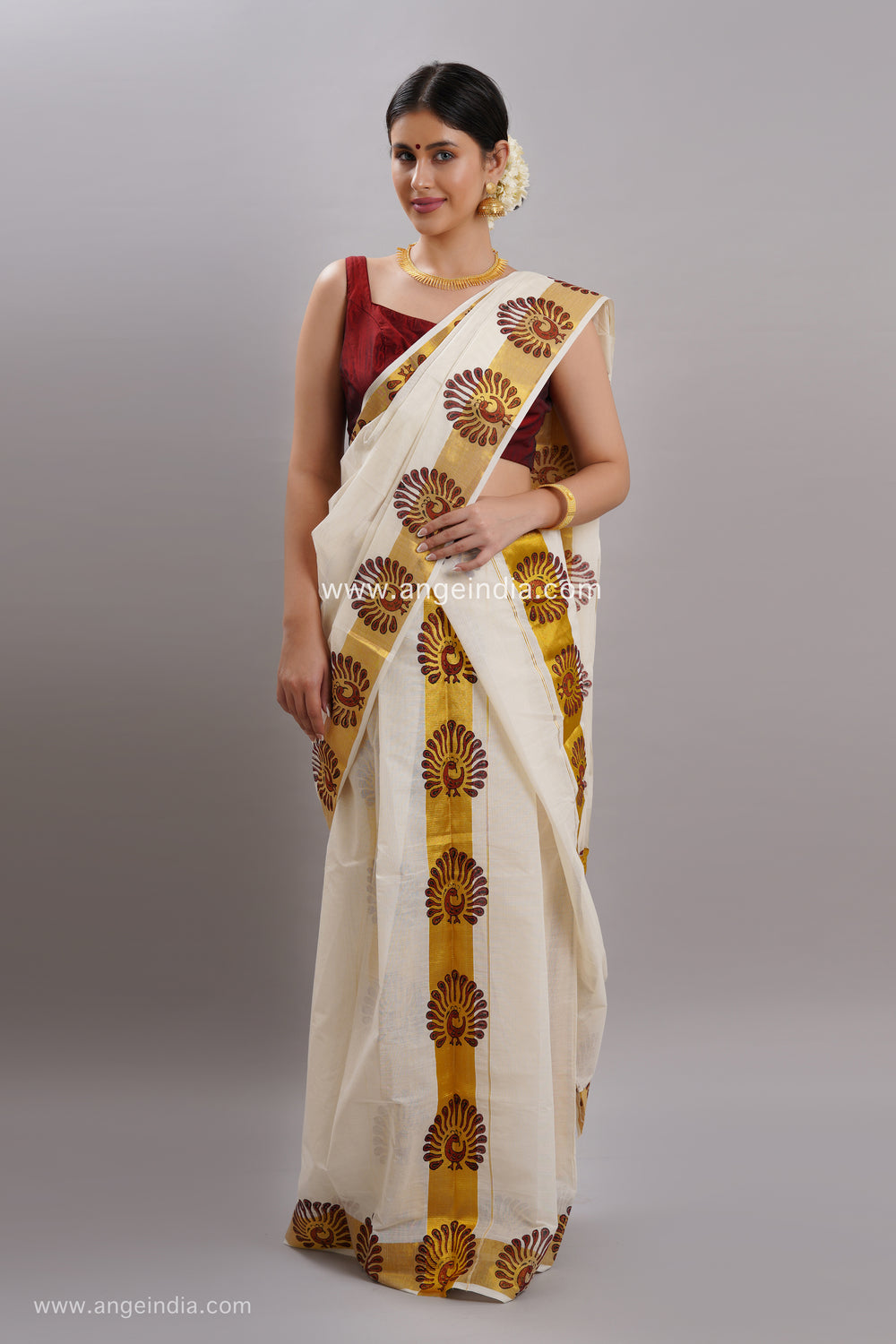 Hand-blocked cotton set mundu. Comes with hand blocked blouse fabric.