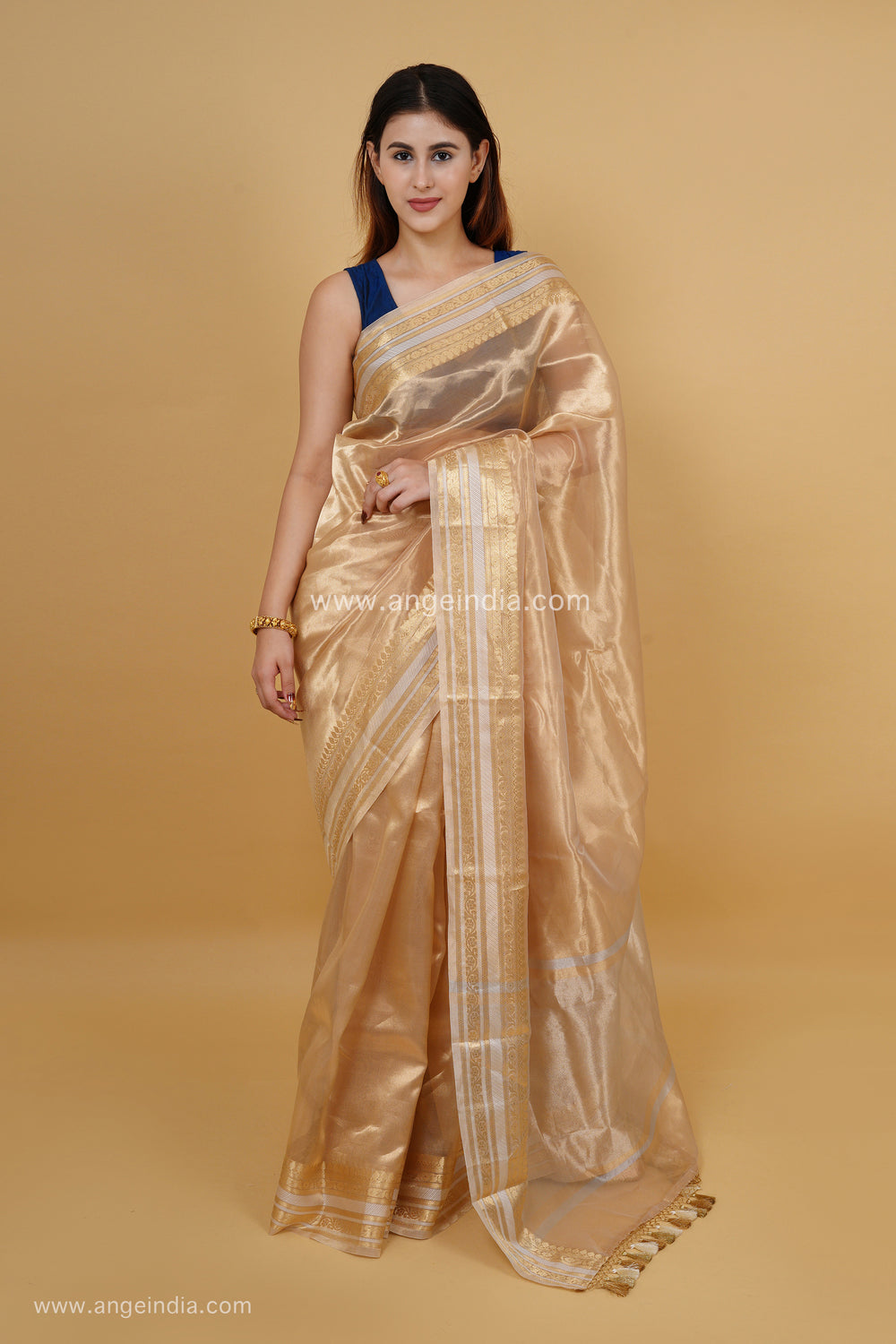 A very rich tissue gold organza saree, finished with a heavy pallu and silk tassels. A very versatile saree that can be a staple in your wardrobe to play mix and match with quirky blouses to bring your chic on!