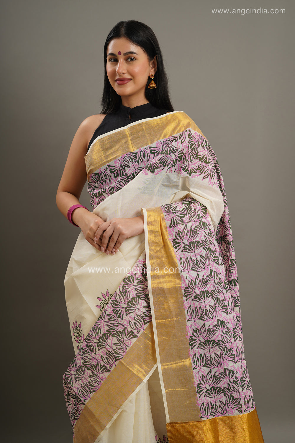 Embrace the spirit of the festive season with the timeless beauty of a Kerala saree, crafted in soft cotton and adorned with gold kasavu. This exquisite piece features delicate purple Olam flowers, adding a touch of vibrant elegance to the classic design. Perfect for the celebrations, this saree combines tradition with a modern flair, ensuring you stand out with grace and style.